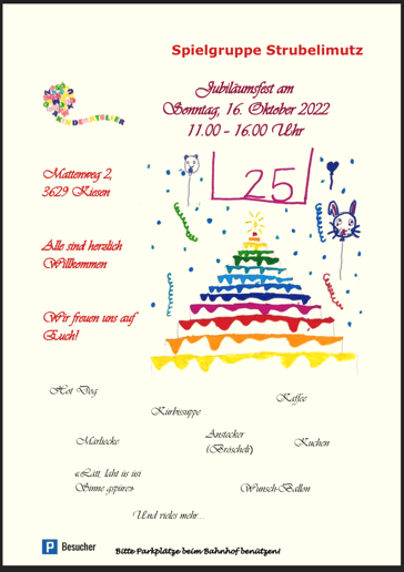 Am 16. Oktober 2022 durften wir mit euch zusammen das 25- jährige Jubiläum der Spielgruppe Strubelimutz feiern! Alle strahlten mit der Sonne um die Wette und wir freuten uns über den Besuch von Gross und Klein. Ein herzliches Dankeschön an alle, die dazu beigetragen haben, dass es ein wunderschönes, farbenfrohes und gelungenes Fest wurde!